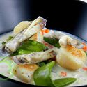 Coquille st jacques au magrets de canard, jus de mangue et mousseline de carottes
